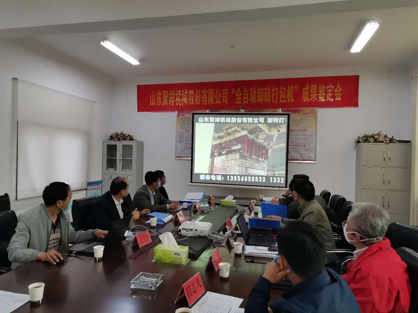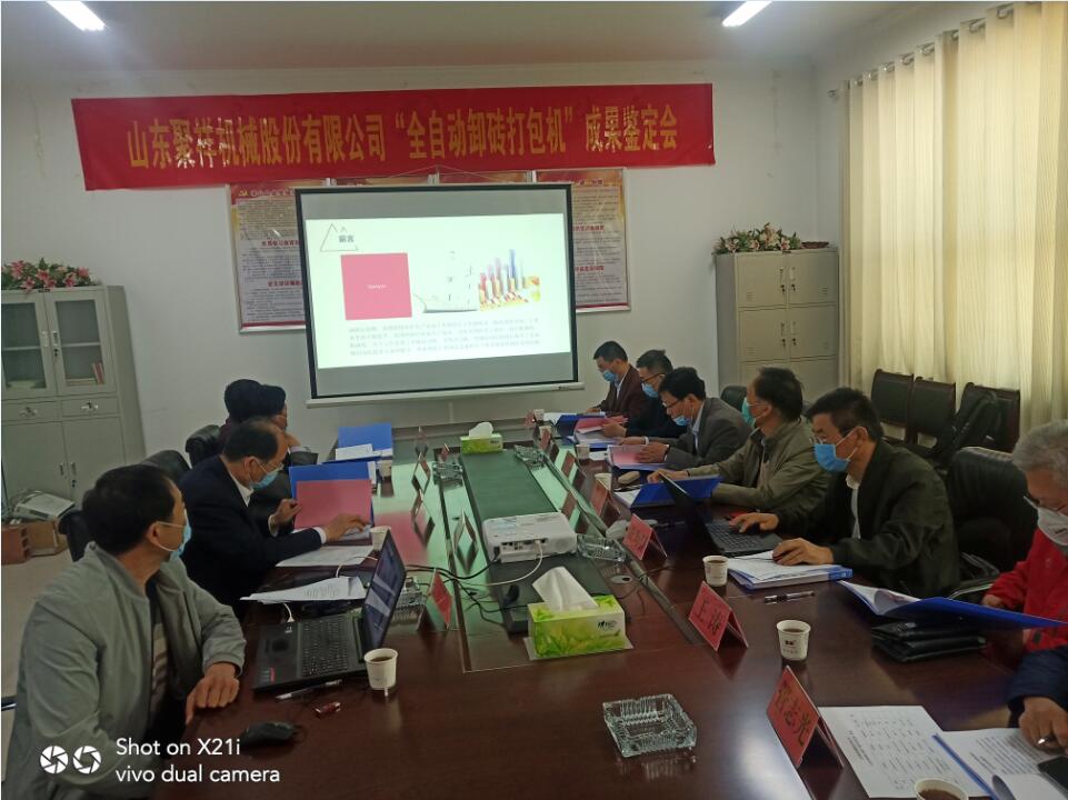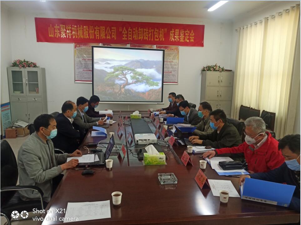 2020428日,菏澤市科技局組織國內知名專家對山東聚祥機械股份有限公司全自動卸磚打包系統進行了科技成果鑒定。與會專家,通過聽取項目匯報、查閱相關資料、觀看全自動卸磚打包系統現場工作視頻,大家一致認為:山東聚祥機械股份有限公司全自動卸磚打包系統整體技術達到國內領先水平,建議進一步提高產品的智能化水平,加大產品的推廣力度。